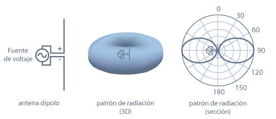 En las antenas omnidireccionales, la señal es dirigida en un plano horizontal de 360°, aunque su apertura vertical suele ser bastante reducida. El patrón teórico de radiación es semejante a un «donut», por lo que su centro es un «0», o como una bombilla, donde la intensidad de la luz es inferior a la del foco de una linterna.
