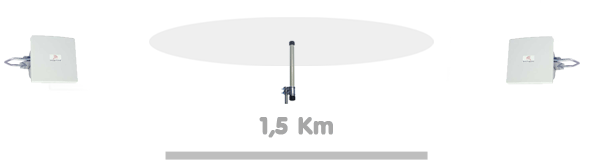 En el esquema podemos observar que la estación base utiliza una antena omnidireccional y los clientes antenas directivas. La apertura horizontal de la antena omni es de 360º y las estaciones se encuentran a una distancia de 1,5 Km. En muchas ocasiones los clientes usan antenas dipolo de poca ganancia, de unos 3dBi, por lo que la distancia entre estación base y cliente será inferior que si se usaran antenas directivas tipo planar como en este caso.
