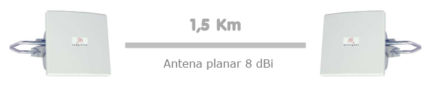 Antenas directivas tipo planar de 8dBi de ganancia y una apertura de 60 º x 60 º. Con esta configuración se pueden obtener enlaces de alrededor de 1,5 Km, dependiendo también de la potencia de salida de la radio.