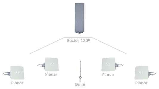 En el esquema podemos observar que la estación base utiliza una antena sectorial y los clientes antenas directivas tipo planar y omnidireccional. La apertura horizontal de la antena sectorial es de 120º y 8º verticalmente. Estas antenas ofrecen un amplio sector de cobertura horizontal, pero debemos tener en cuenta que su apertura vertical es muy reducida, así que depende de donde la situemos, si los clientes están muy próximos y hay mucho desnivel entre ambos, es probable que no tengan cobertura. Podemos usar un array de tres antenas sectoriales de 120º y conseguir una cobertura en todas las direcciones con un rango de alcance mayor que una antena omnidireccional convencional.