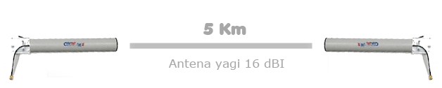 Antenas directivas tipo yagi de 16dBi de ganancia y una apertura de 24 º x 30 º. Debido a que la apertura en menor que una antena planar, se requiere más precisión para el alineamiento. Con esta configuración se pueden obtener enlaces de alrededor de 5-6 Km, dependiendo también de la potencia de salida de la radio.