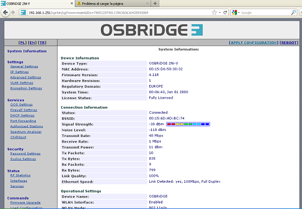 En System Information podemos comprobar como se ha realiado correctamente el enlace, ya que el “status” aparece como “connected”, se muestran también los valores de señal y ruido.