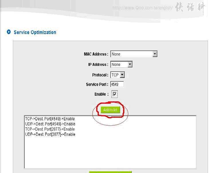 Añadimos el protocolo, el nº del puerto, activamos la casilla Enable y Add to List.
