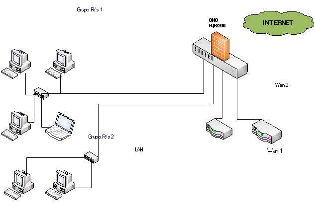 Se aprecian un grupo de PC’s de van a un Switch y de ahí al QNO. Éste a su vez tiene 2 WAN’S que le entran por sus entradas respectivas y que con ellas salen a Internet.