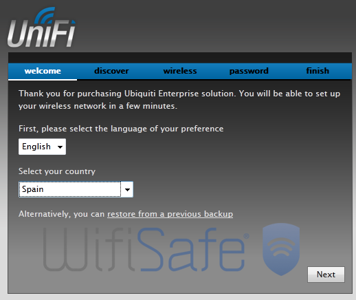 La primera vez que accedemos a la interfaz de configuración, tenemos que rellenar los campos de configuración que nos servirán para configurar los puntos de acceso. Primero hay que seleccionar el idioma (actualmente está en Ingles), y seleccionar nuestro País, ya que en función del País seleccionado la potencia de los equipos se ajusta así como los parámetros de los canales (no es lo mismo el régimen regulatorio con ETSI que FCC).