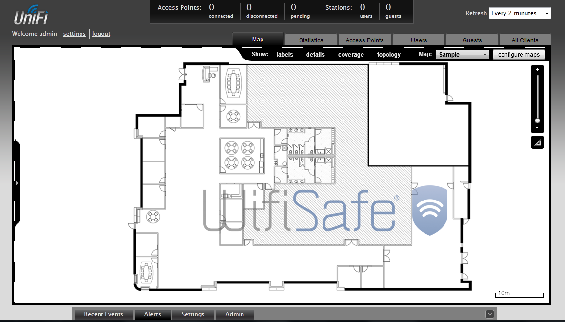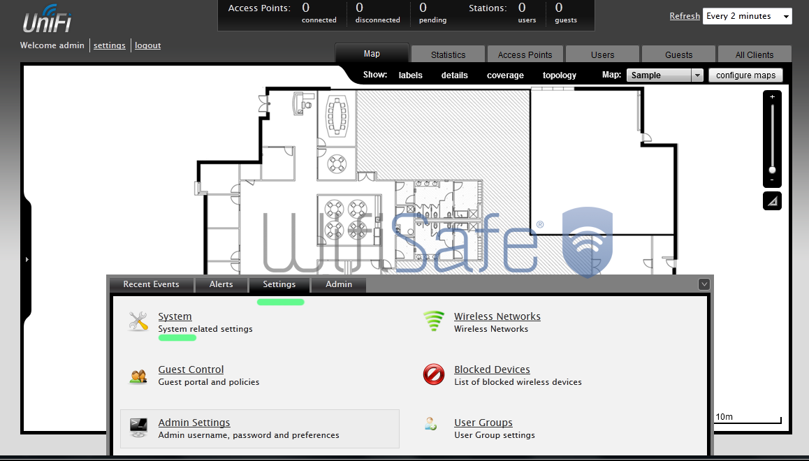 Una vez hemos accedido con las credenciales, podemos ver una visión general del controlador, en este caso como todavía no hemos añadido ningún AP todos los valores están a 0. Como podéis ver en la imagen, se podrían colocar los AP’s de forma visual en el mapa de la instalación en concreto (se pueden cargar vuestros propios mapas), pero no vamos a entrar en detalles dentro de este manual.