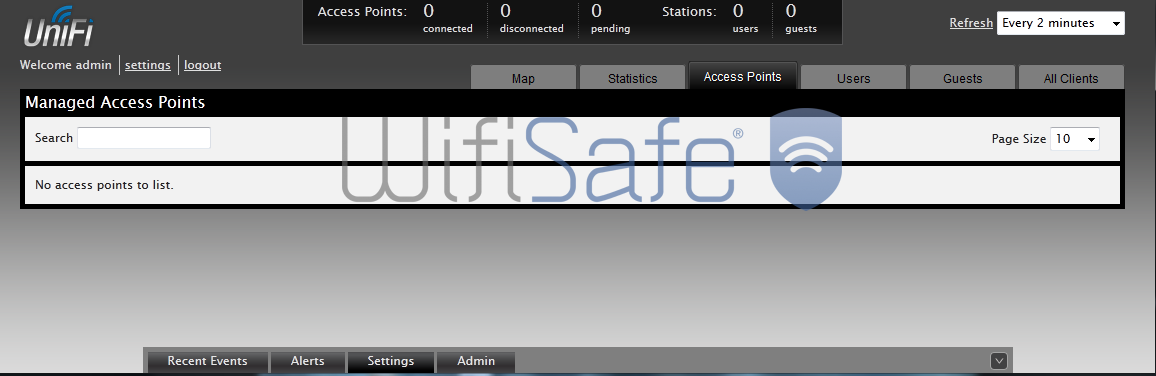 Una vez ya hemos configurado nuestro controlador, procedemos a buscar los puntos de acceso. En la siguiente imagen pulsamos en la pestaña de “Access Points” y veremos todos los puntos de acceso Unifi que hay en nuestra red. En este momento no tenemos ningún dispositivo conectado a la red, por lo que no aparece ninguno, ni es “connected”, “Disconnected” ni en “pending”.